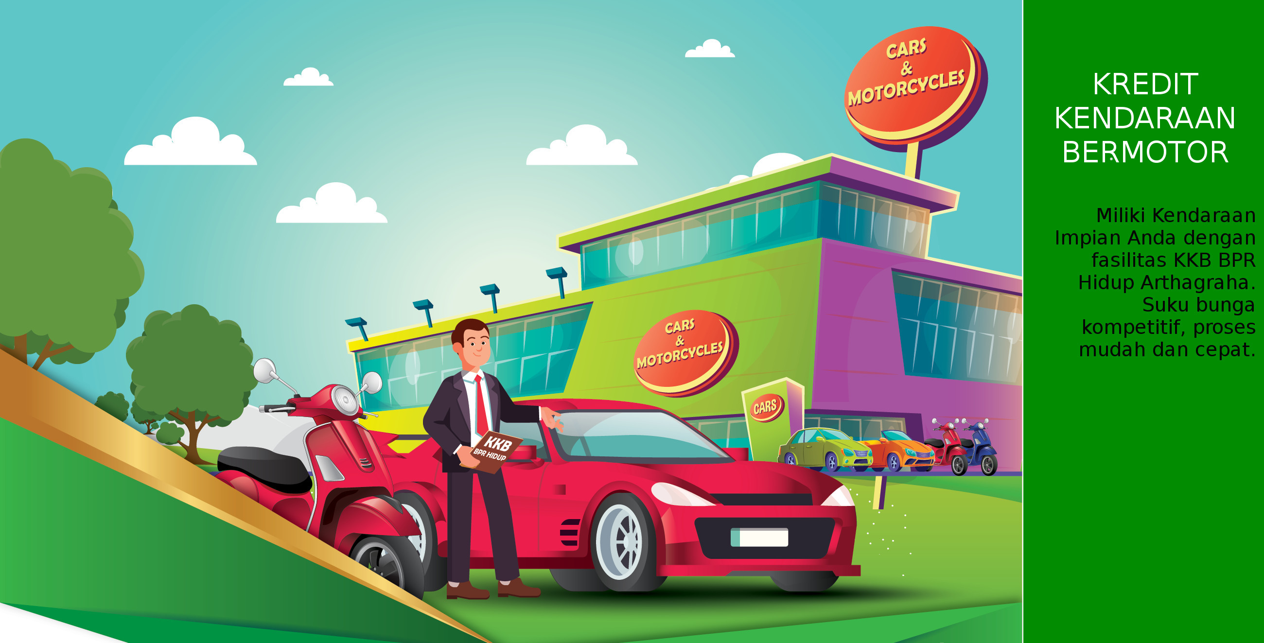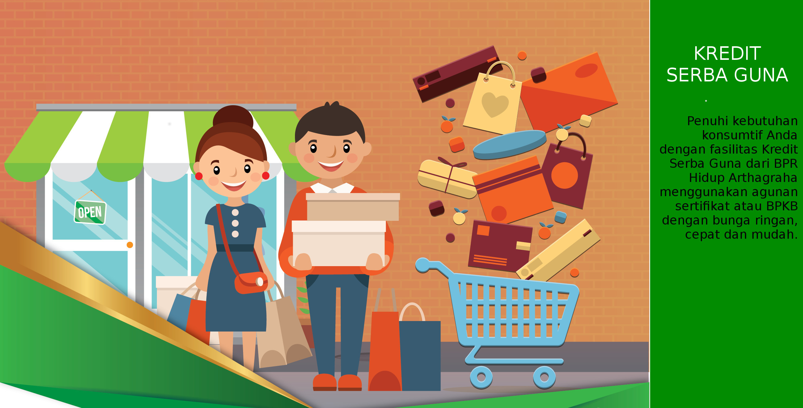 Penuhi kebutuhan konsumtif Anda dengan fasilitas Kredit Serba Guna dari BPR Hidup Arthagraha, menggunakan agunan sertifikat atau BPKB dengan bunga ringan, cepat dan mudah.