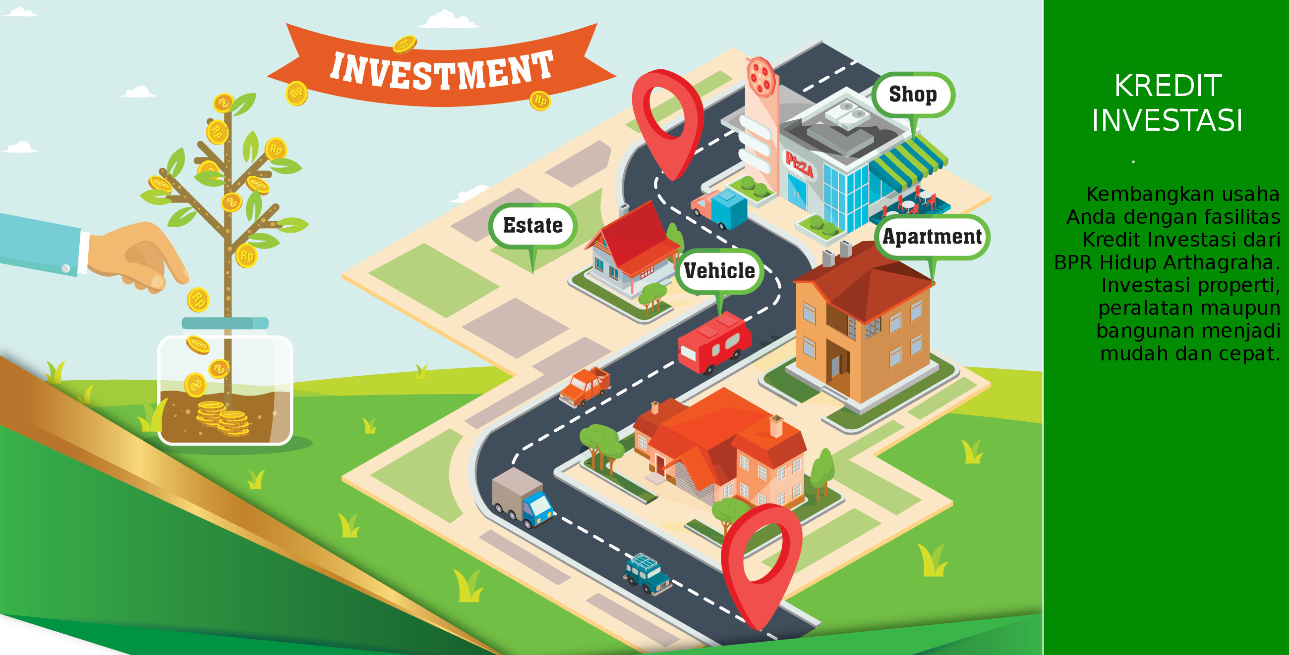 Kembangkan usaha Anda dengan fasilitas Kredit Investasi dari BPR Hidup Arthagraha. Investasi properti, peralatan maupun bangunan menjadi mudah dan cepat.