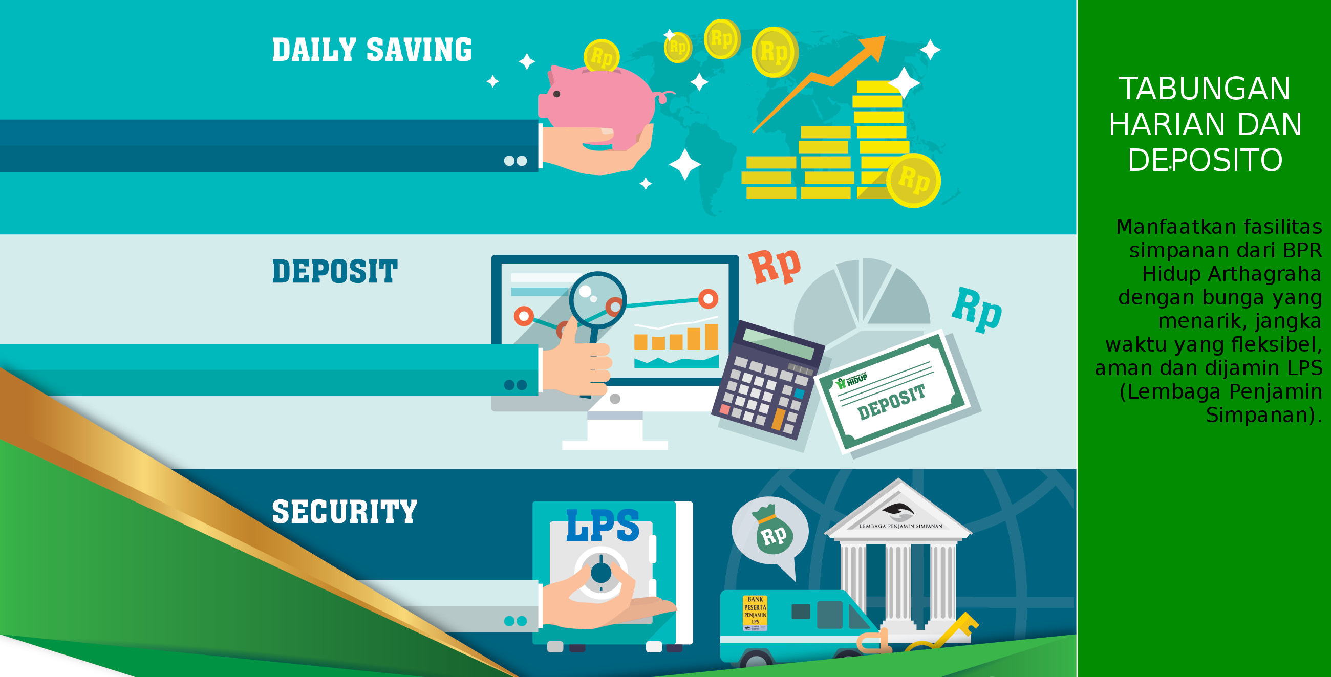 Manfaatkan fasilitas simpanan dari BPR Hidup Arthagraha dengan bunga menarik, jangka waktu yang fleksibel, aman dan dijamin LPS (Lembaga Penjamin Simpanan).